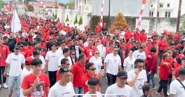 Tondano – Ribuan militan Pasangan Calon (Paslon) Bupati dan Wakil Bupati Minahasa dari PDI Perjuangan Robby Dondokambey-Vanda Sarundajang (RD-Vasung) menggebrak Tondano, Kabupaten Minahasa, Sulawesi Utara. Di hari ketiga pendaftaran Paslon, RD-Vasung bersama keluraga tercinta seluruh tim dan relawan hadir mendaftar di Kantor KPU Minahasa, Kamis (29/82024).