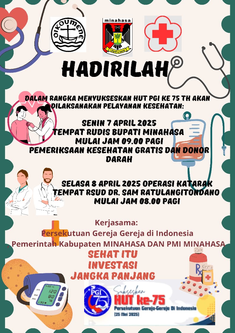 Minahasa – Dalam rangka memperingati Hari Ulang Tahun ke-75 Persatuan Gereja-gereja di Indonesia (PGI), digelar kegiatan pelayanan kesehatan bagi masyarakat, yang berlangsung pada Senin, 7 April 2025. Kegiatan ini bertempat di Rumah Dinas Bupati Minahasa dan dimulai pukul 09.00 WITA.