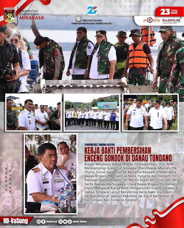 Minahasa- Bupati Minahasa, Robby Dondokambey, S.Si, MAP, mendampingi Gubernur Sulawesi Utara, Mayjen TNI (Purn) Yulius Selvanus, SE, dalam kegiatan Karya Bakti Pembersihan Eceng Gondok di Danau Tondano, Rabu (23/4/25)