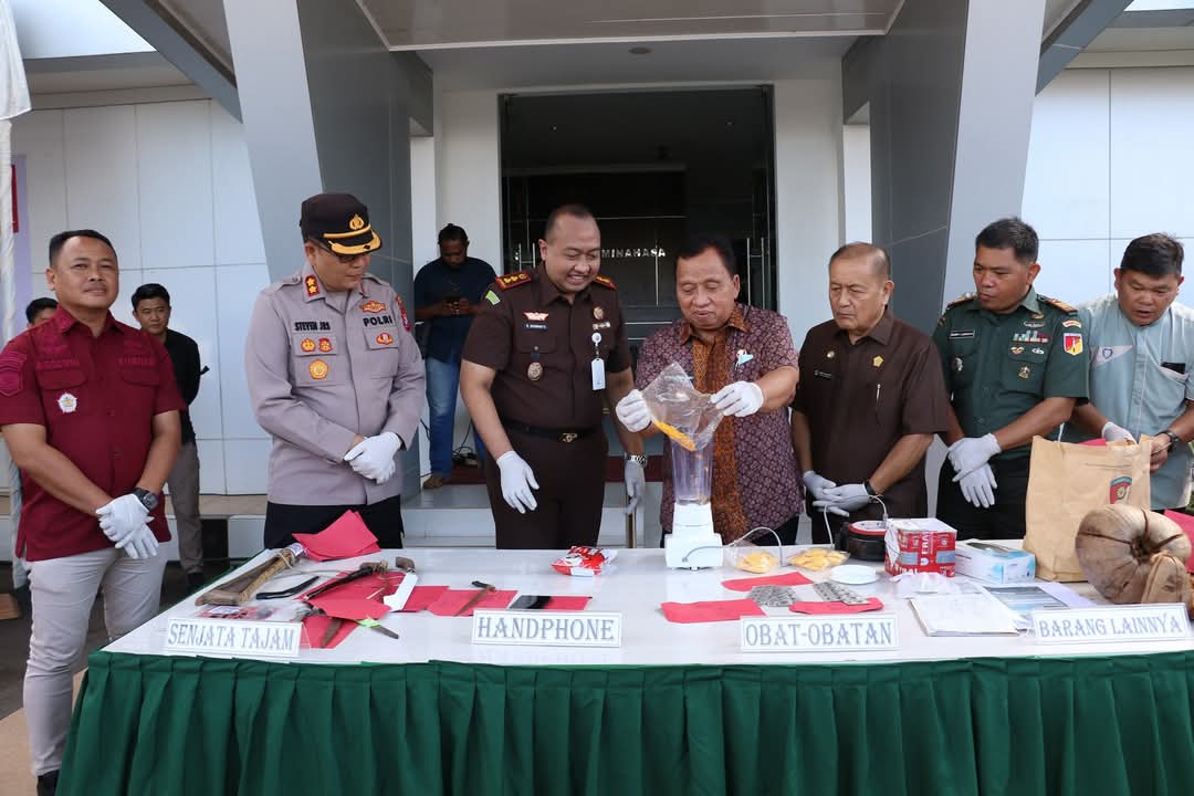 Pemusnahan barang bukti berupa senjata tajam, obat-obatan, handphone, buku rekapan judi toto gelap, dan lainnya, di halaman Kantor Kejaksaan Negeri (Kejari) Minahasa, Kamis (8/5/25) pagi.