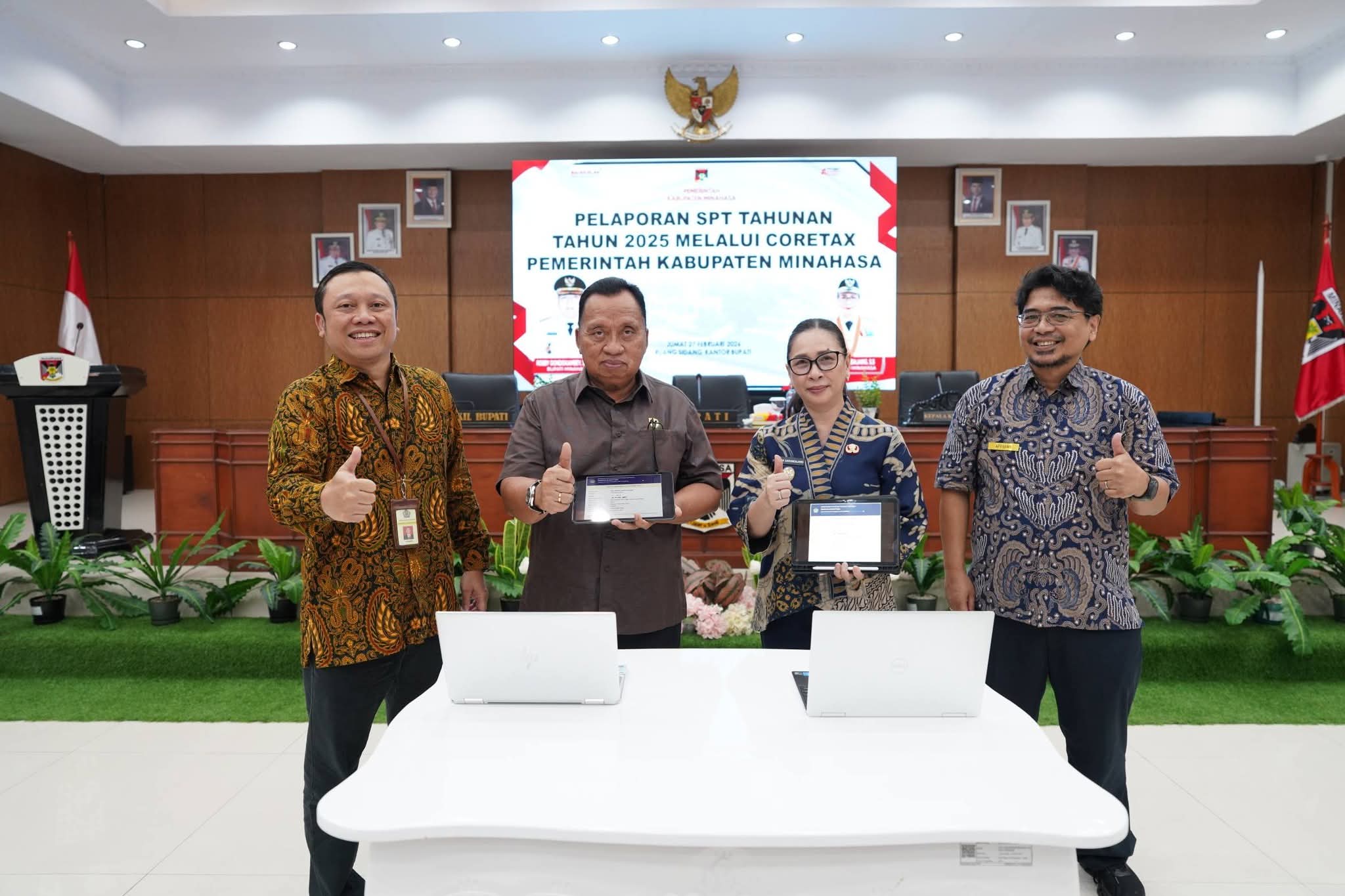 MINAHASA – Bupati Minahasa, Robby Dondokambey, S.Si., MAP., bersama Wakil Bupati Minahasa, Vanda Sarundajang, SS., menghadiri sekaligus memimpin kegiatan Pelaporan Surat Pemberitahuan (SPT) Tahunan Tahun Pajak 2025 melalui sistem Coretax di lingkungan Pemerintah Kabupaten Minahasa. Kegiatan tersebut dilaksanakan di Ruang Sidang Kantor Bupati Minahasa dan diikuti oleh jajaran pejabat serta Aparatur Sipil Negara (ASN), Jumat 27 Februari 2026